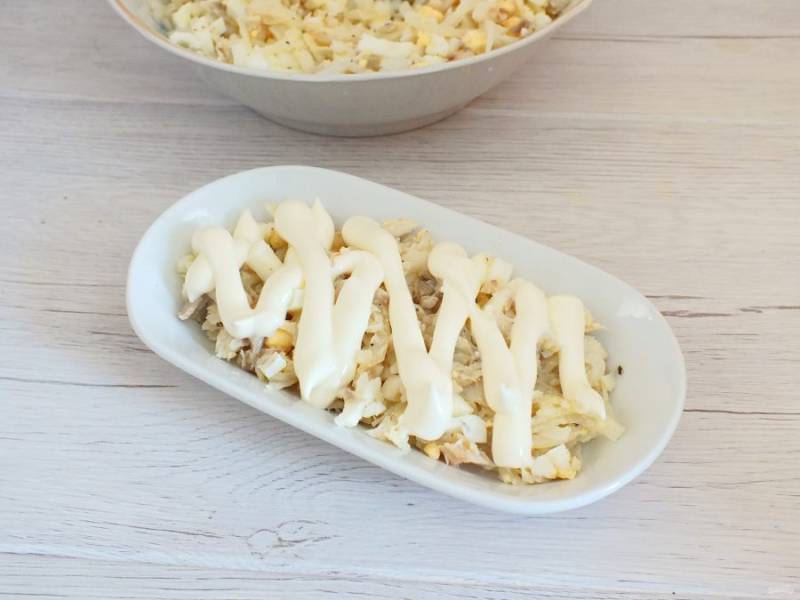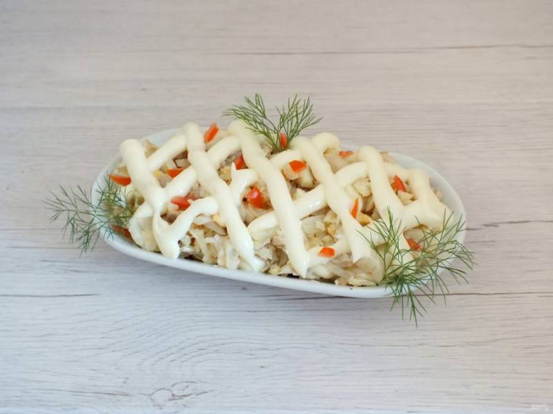 Подать салат можно как индивидуально, так и в одном салатнике. Для индивидуальной подачи, часть рыбной массы выложите в маленький салатник, сделайте сеточку из майонеза, сверху выложите еще рыбную массу. Повторите сеточку из майонеза. Для подачи в общем салатнике, заправьте рыбную массу по вкусу майонезом, перемешайте. Оформите по вкусу.