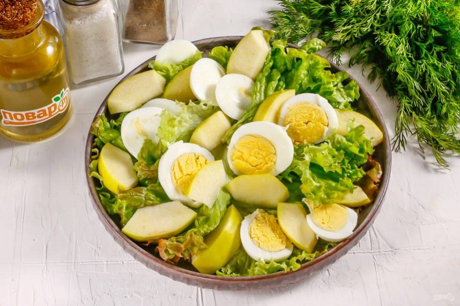 Яблоко разрежьте на четвертинки, срежьте с него семенные блоки и промойте мякоть. Нарежьте ломтиками и выложите между листьев салата.