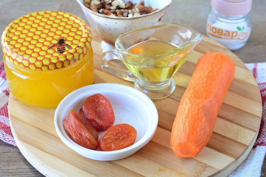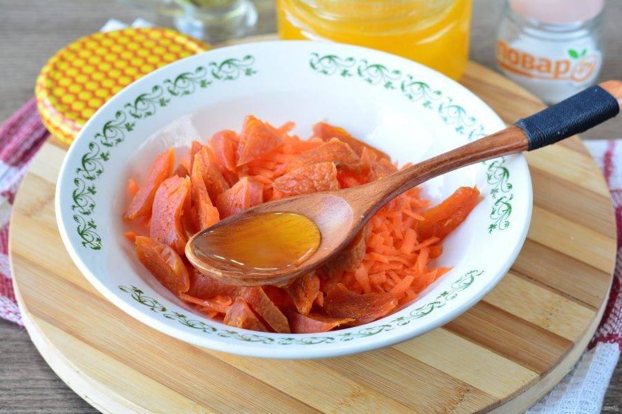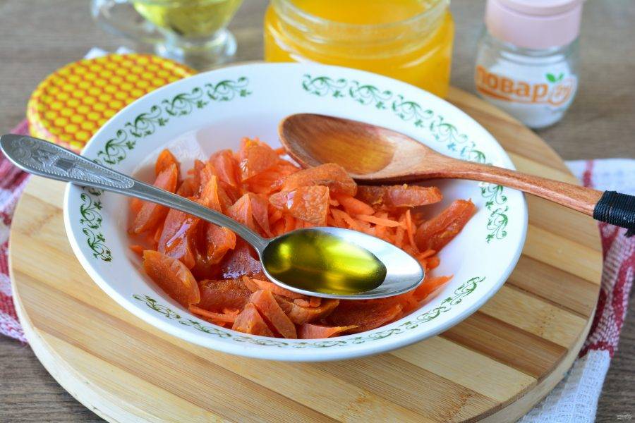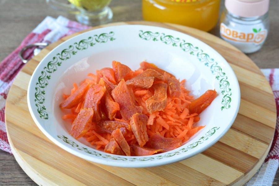 Хорошо промойте курагу, нарежьте средними кусочками, добавьте к морковке.