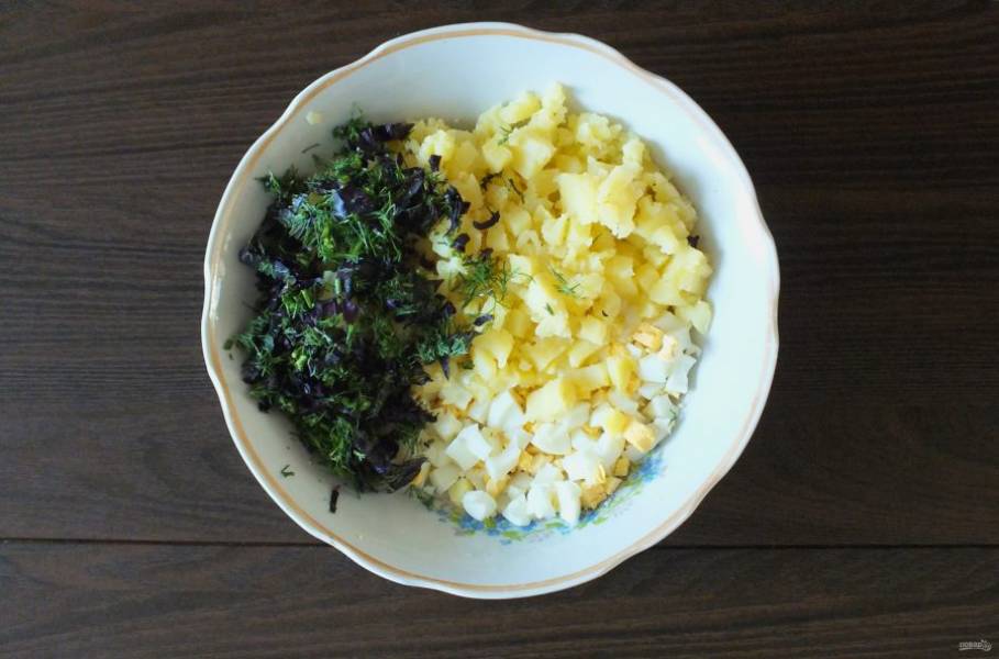 В просторный салатник нарежьте кубиком яйца и картофель. Добавьте мелко нарезанную зелень.