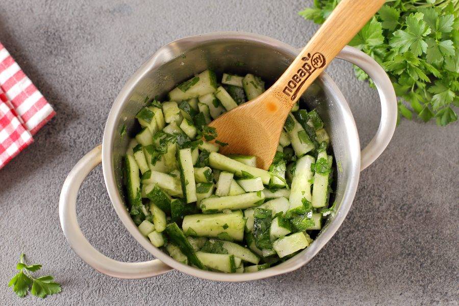 Хорошо все перемешайте и оставьте при комнатной температуре на 4 часа. Периодически салат необходимо перемешивать.