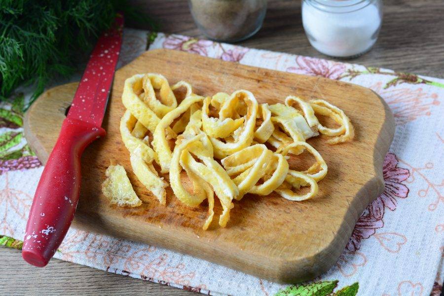 Салат из яичных блинчиков и колбасы — отличная закуска в будни и праздники. В нем все ингредиенты хорошо сочетаются, дополняя друг друга. В меру острый, с легкой ноткой копченостей, свежий и вкусный.