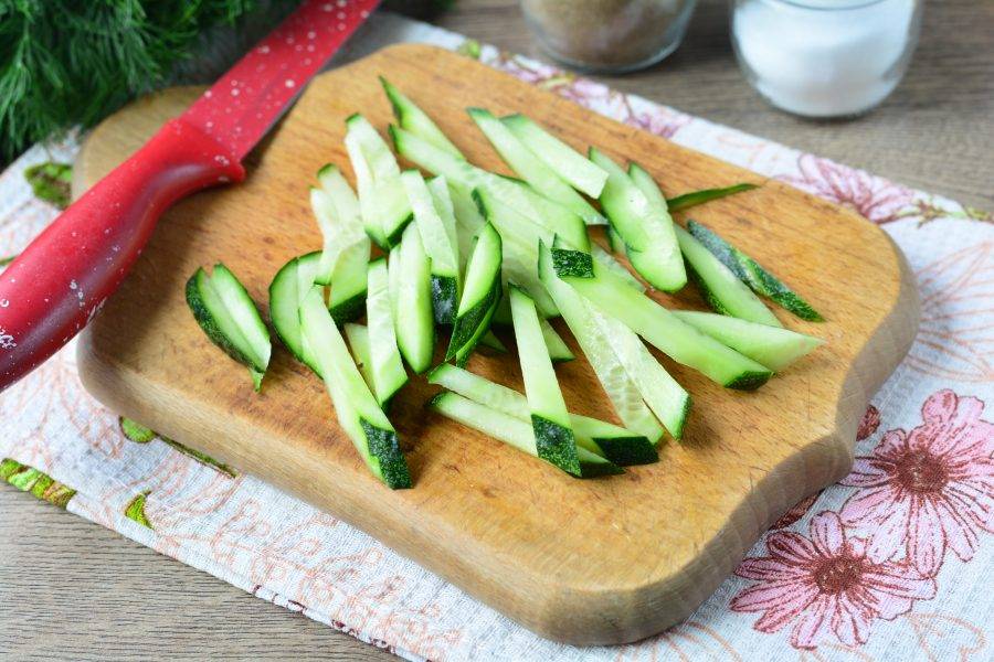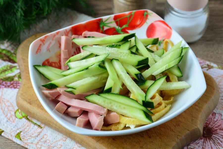 Сытный и вкусный салат с блинами и огурцом можно приготовить за 15 минут, особенно если блины вы пожарите заранее. Допустимо использовать любой сорт колбасы или ветчины и заправить блюдо сметаной.