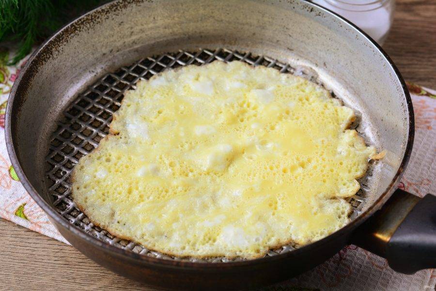 Смажьте сковороду маслом, разогрейте на среднем огне, влейте омлетную массу и жарьте блинчик пару минут под крышкой.