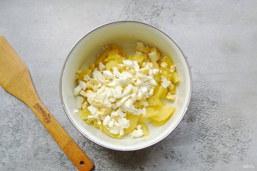 Картофель отварите в кожуре, охладите и очистите. Яйца сварите вкрутую, охладите и очистите. Оба ингредиента мелко нарежьте и выложите в миску.