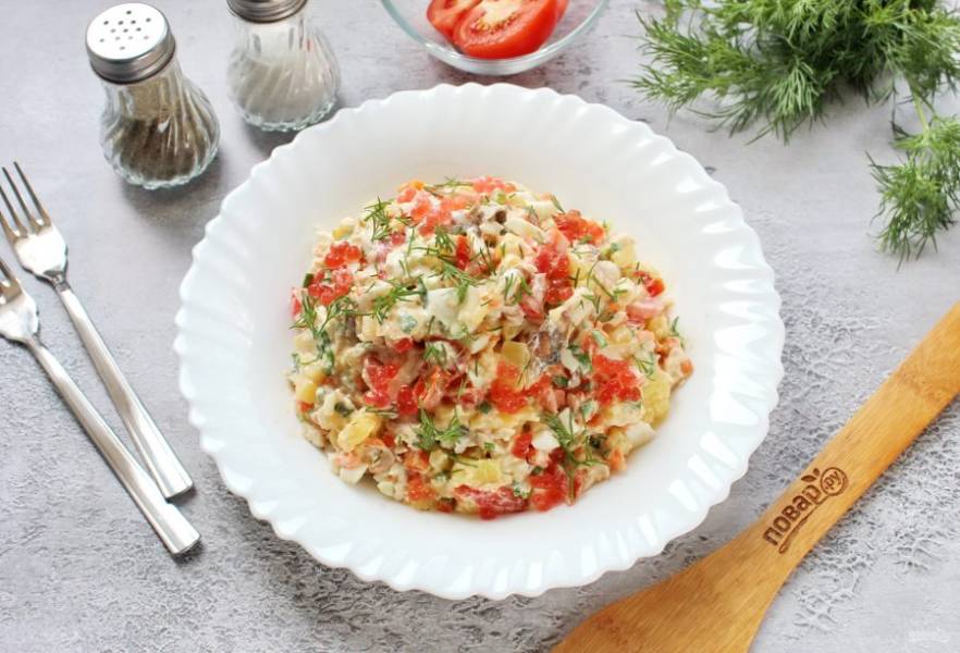 У отварного хека удалите хребет и кожу. Выложите кусочки рыбы в салат. Посолите, поперчите и заправьте майонезом.