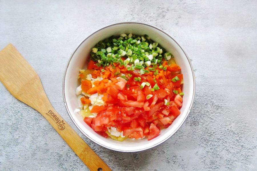 Зеленый лук помойте и мелко нарежьте. Выложите в салат.