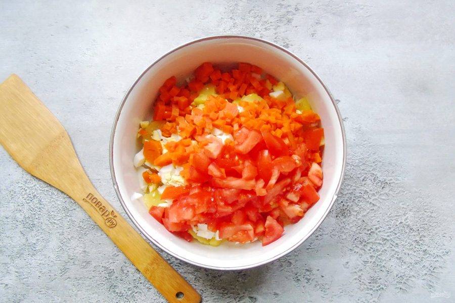 Морковь отварите, охладите, очистите. Помидоры помойте. Нарежьте морковь и помидоры кубиками.