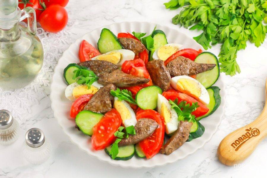 Подайте салат к столу, пока печень теплая. Дополните блюдо на ужин бокалом охлажденного белого вина. Приятного вам аппетита!