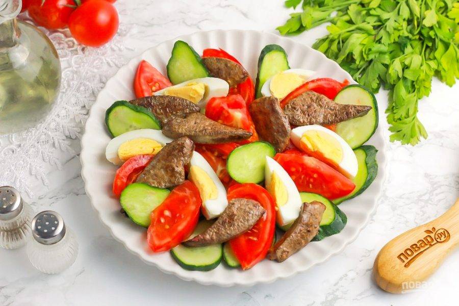 Далее дополните салат горячей жареной печенью, выкладывая ее прямо со сковороды. Если кусочки крупные, то их можно нарезать чуть мельче.