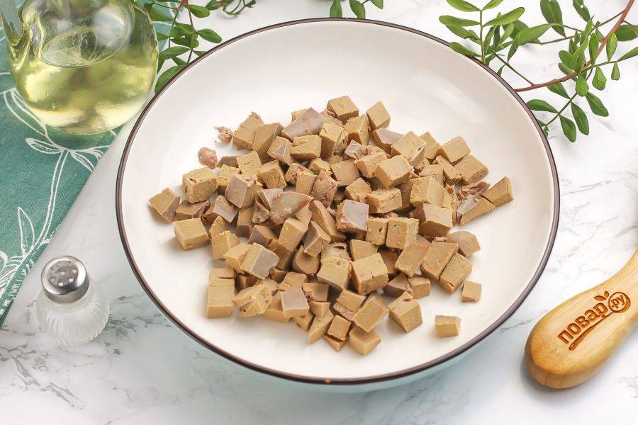 Остудите печень и нарежьте ее мелкими или средними кубиками, высыпьте нарезку в глубокую емкость.