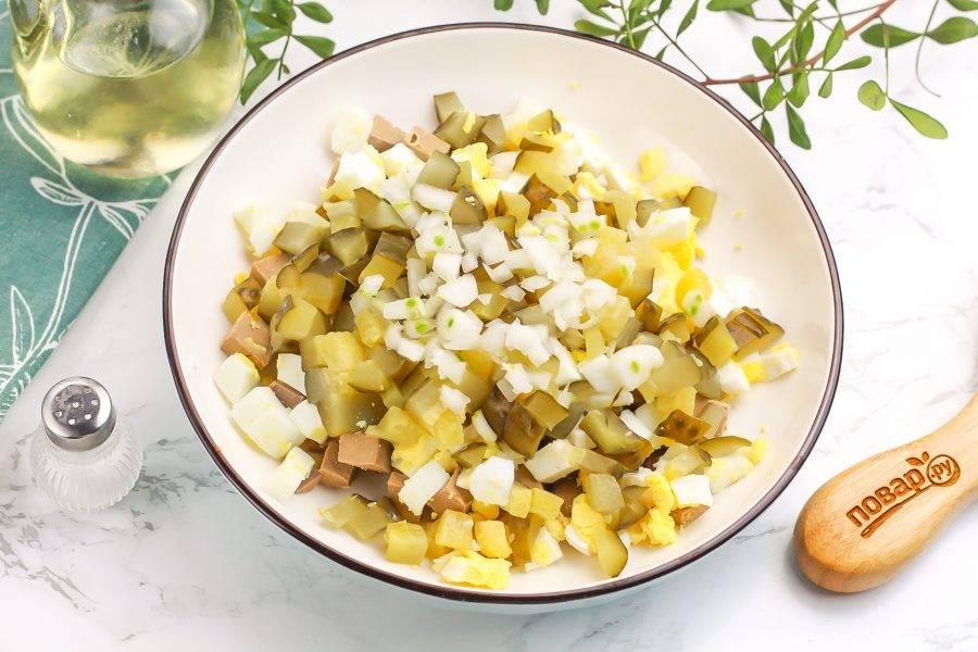 Нарежьте соленые огурцы мелкими кубиками, отжав из нарезки рассол. Мелко нарежьте репчатый лук и добавьте оба ингредиента в емкость. По желанию репчатый лук можно заменить зеленым или красным.