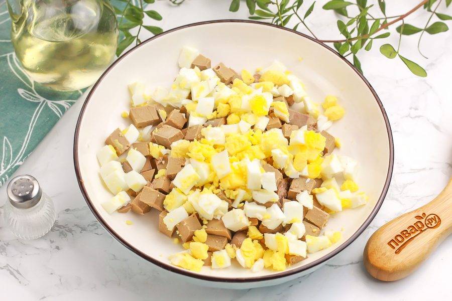 Очистите отварные куриные яйца от скорлупы и промойте в воде. Нарежьте такими же кубиками и добавьте к печени.