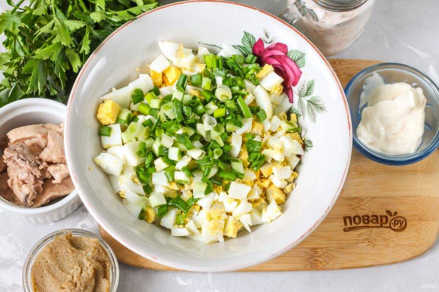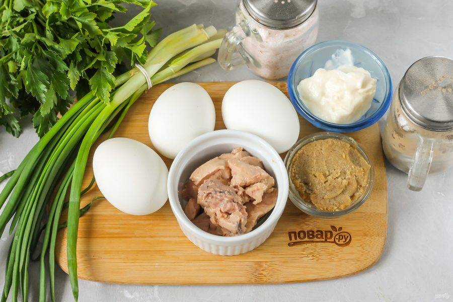 Подготовьте указанные ингредиенты. Куриные яйца отварите заранее и остудите в ледяной воде.