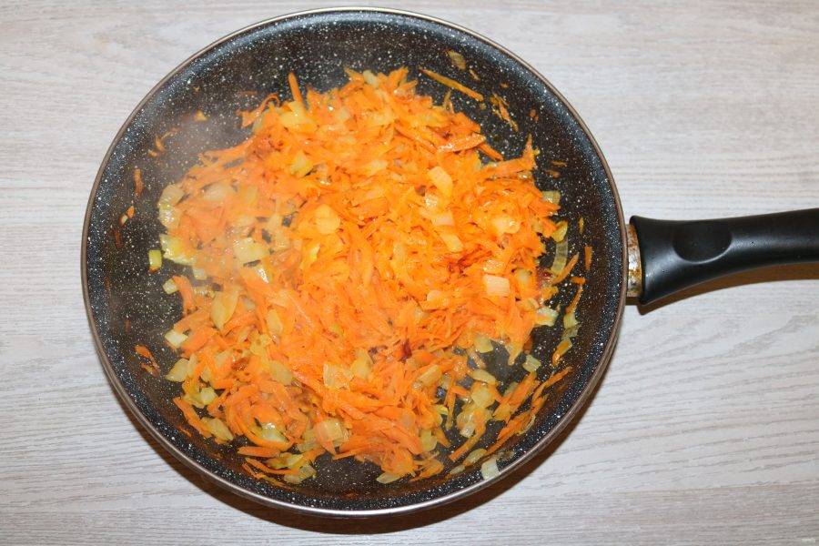 Морковь натрите на крупной тёрке, добавьте к луку, обжаривайте вместе.