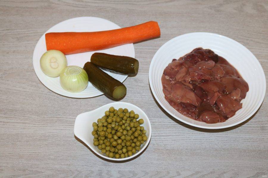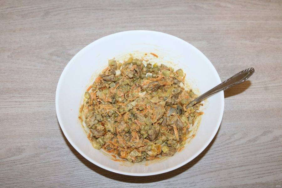 Салат с куриной печенью и горошком понравится всем, он получается сытным, питательным и очень вкусным! Делюсь рецептом!