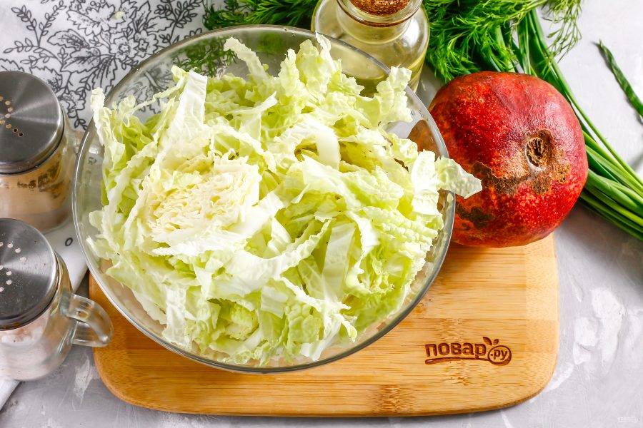 Пекинскую капусту промойте в воде и нашинкуйте ее половину, выкладывая нарезку в глубокую миску. Если у вас большая семья, то дорежьте и вторую половину овоща.