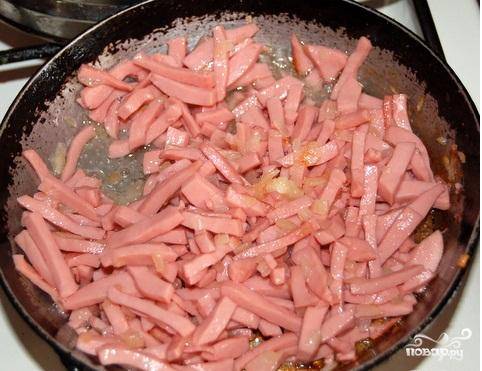 1. Почистить лук и мелко нарезать. На сковороде раскалить растительное масло и обжарить лук до золотистого цвета. Колбасу нарезать тонкой соломкой и пожарить немного вместе с луком.