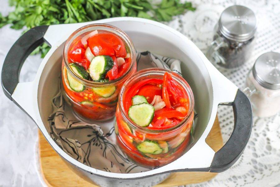 Накройте емкости крышками и стерилизуйте салат около 30 минут, время от времени перемешивая содержимое банок.