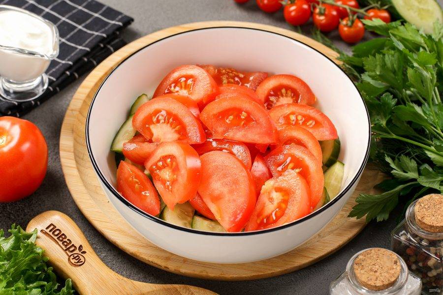 Салат из помидоров и огурцов готов. Сразу же подавайте его к столу.