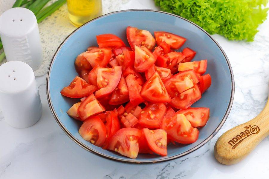 Помидоры промойте в воде и вырежьте из плодов зеленые сердцевинки. Нарежьте томаты крупными ломтиками и высыпьте нарезку в глубокую емкость.