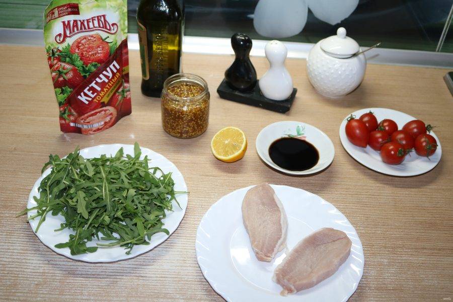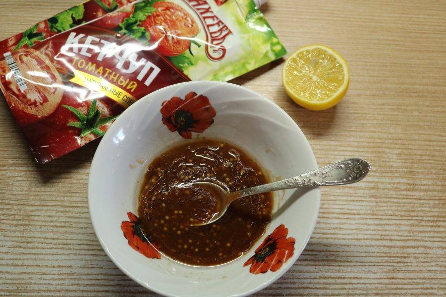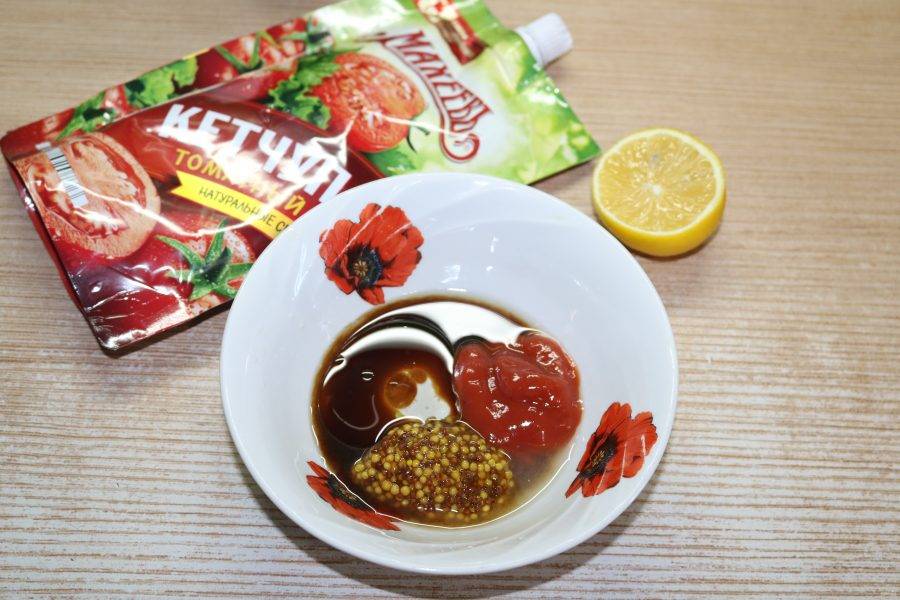 Приготовьте заправку для салата. Соедините в глубокой тарелке кетчуп, горчицу, лимонный сок, сахар, оливковое масло, бальзамический уксус.