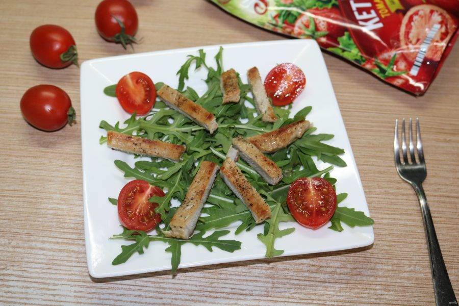 На большое блюдо выложите рукколу, помидоры черри нарезанные половинками и кусочки стейка.