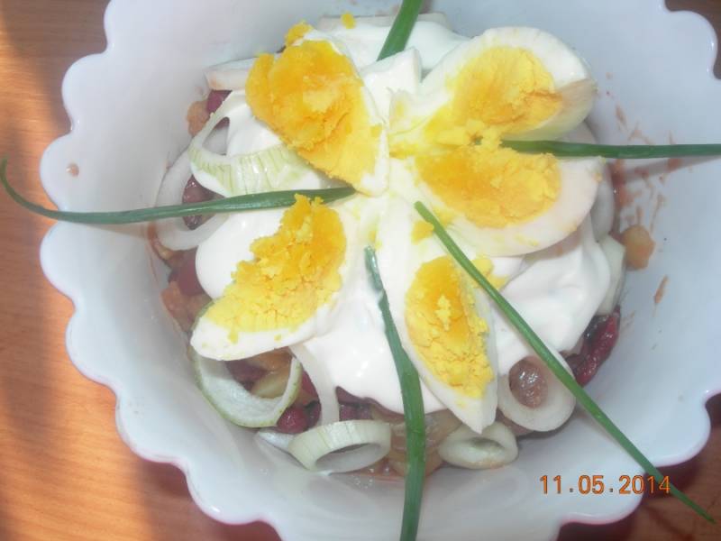 Выложить салат в салатник, полить майонезом, украсить кольцами лука и яйцом