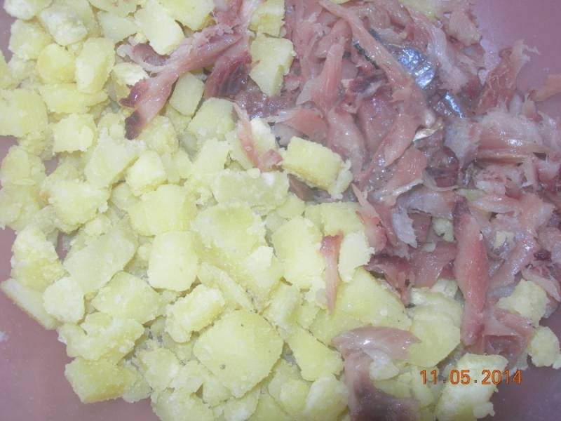 картофель нарезать кубиками, посолить. Сельдь порезать ломтиками.
