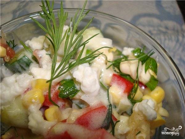 10. Простой рецепт салата из сладкой кукурузы станет более оригинальным, если добавить в него мягкий сыр. Перед подачей можно украсить зеленью.