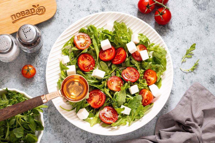 Заправьте салат оливковым маслом, посолите и поперчите.