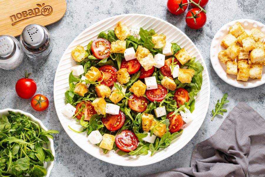 Готовим салат из сухариков с руколой, помидорами черри и сыром фета. Это простой в приготовлении салат, который выглядит красочно и не отнимает много времени на кухне.