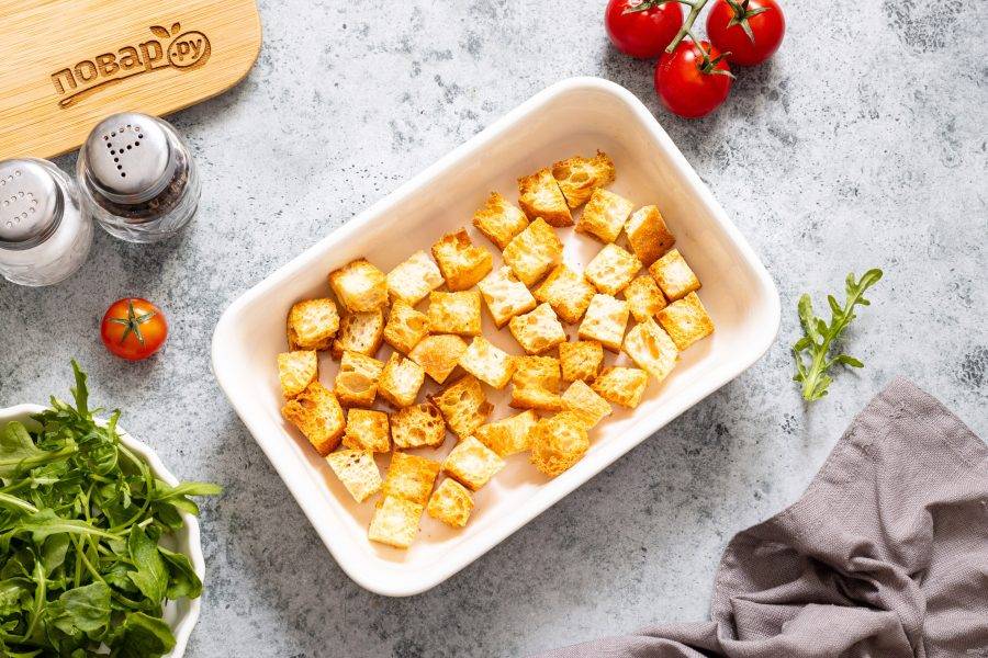 Разогрейте духовку до 180 градусов и подсушите хлеб до румяного цвета.