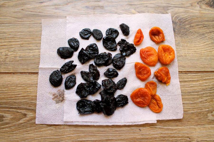 Чернослив и курагу тщательно вымойте в горячей воде и обсушите.