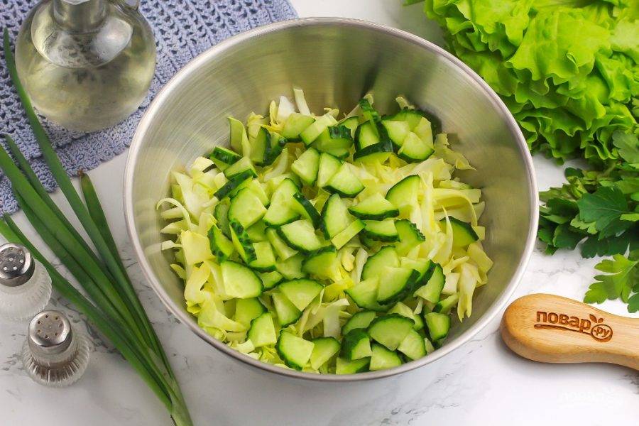 Разрежьте огурец на продольные четвертинки и нарежьте их ломтиками. Добавьте нарезку в емкость к капусте.