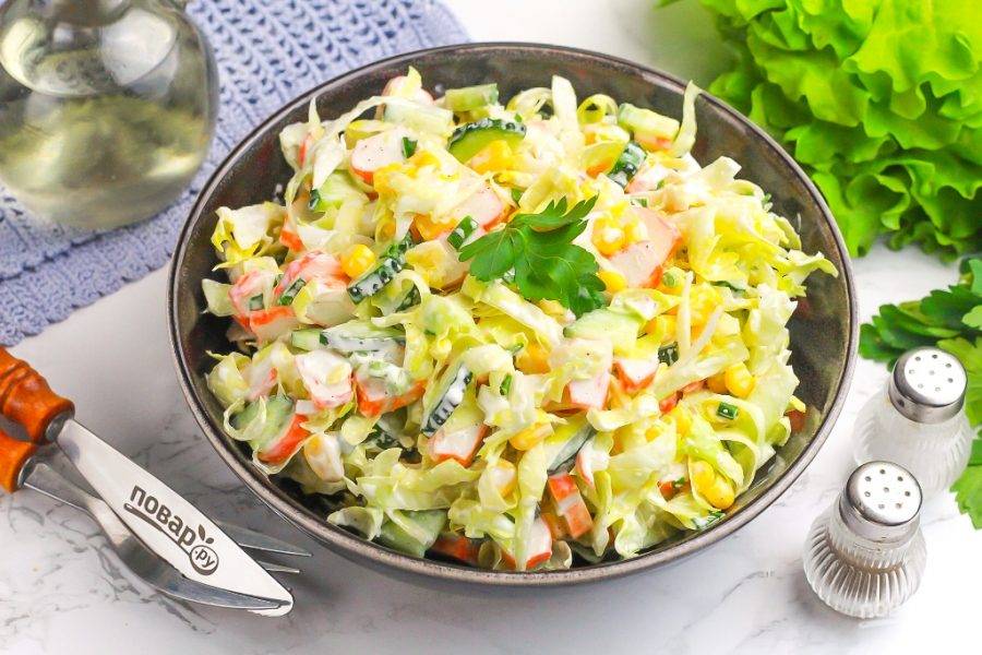 Выложите приготовленный салат из свежей капусты и крабовых палочек в тарелки и продегустируйте. Приятного вам аппетита!