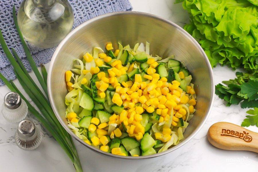 Отожмите консервированную кукурузу от маринада и высыпьте в салатник.