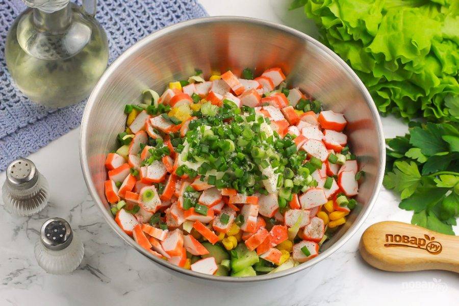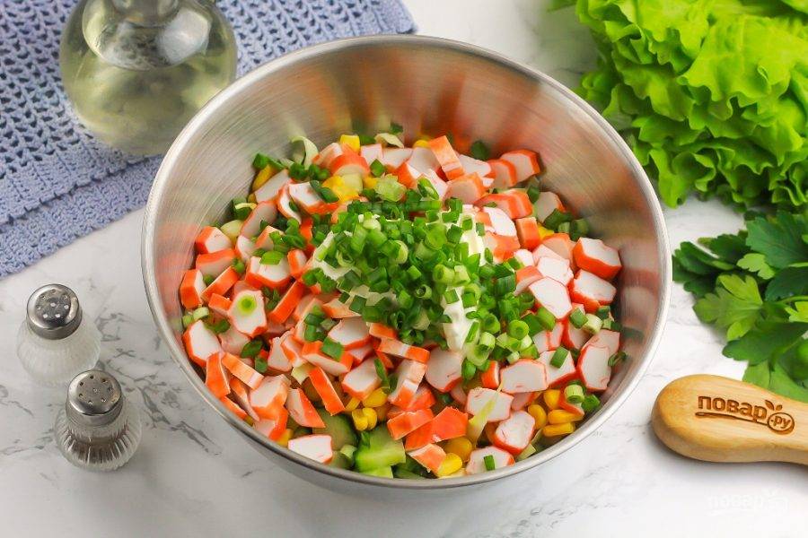 Промойте стебли зеленого лука и измельчите. Всыпьте в емкость к остальным ингредиентам. Можно добавить немного укропа или свежей петрушки.