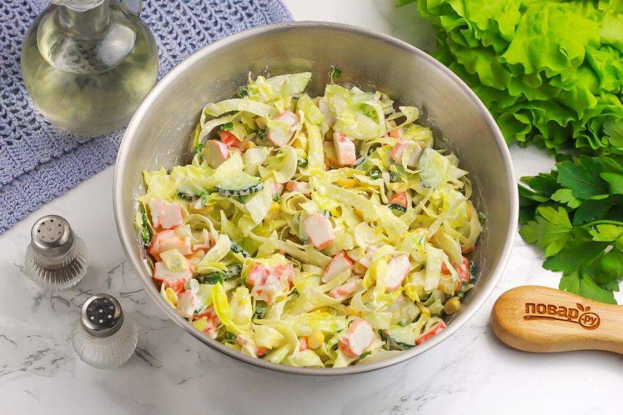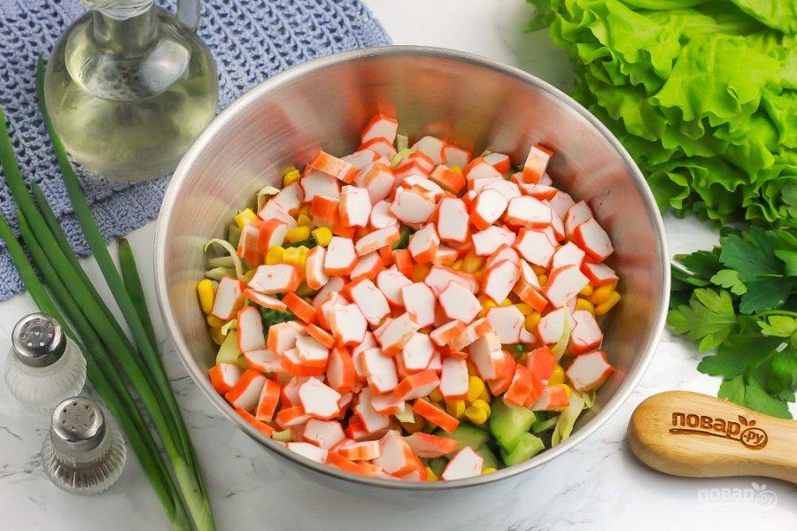 Подготовьте указанные продукты. Снимите верхние листья с вилка капусты и слегка промойте его в воде. Промойте огурец и срежьте хвостики с обеих сторон овоща. Крабовые палочки обязательно разморозьте заранее, если приобретали их замороженными.