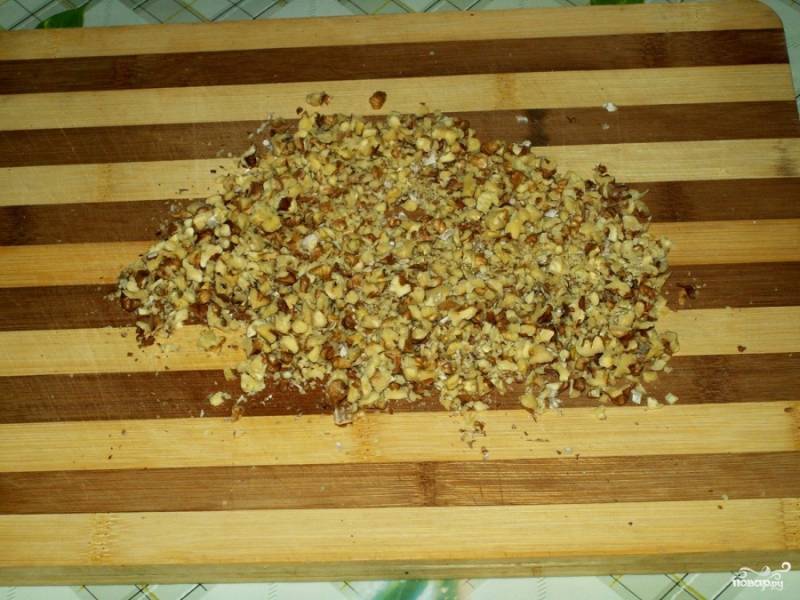 Орехи измельчаем с помощью скалки или блендера. Кому как нравится. В моей семье любят , чтобы кусочки орехов чувствовались в салате.
