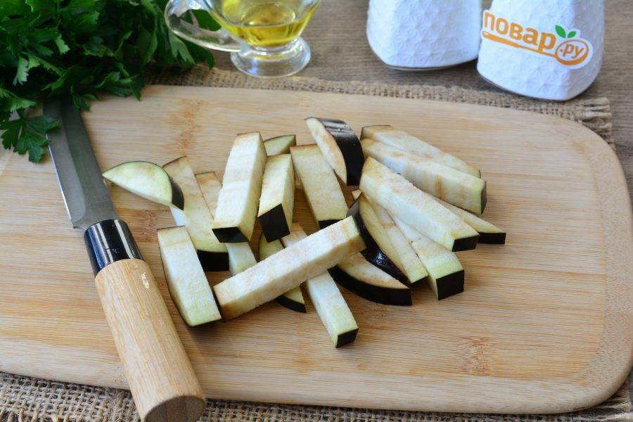 Налейте немного масла в сковороду, разогрейте на среднем огне, всыпьте баклажаны и обжаривайте 4-5 минут, помешивая. Посолите, поперчите по вкусу.