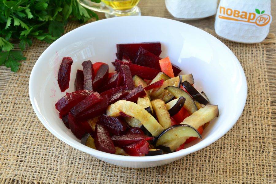 Перемешайте баклажаны, помидоры и добавьте сваренную свеклу, нарезанную брусочками.