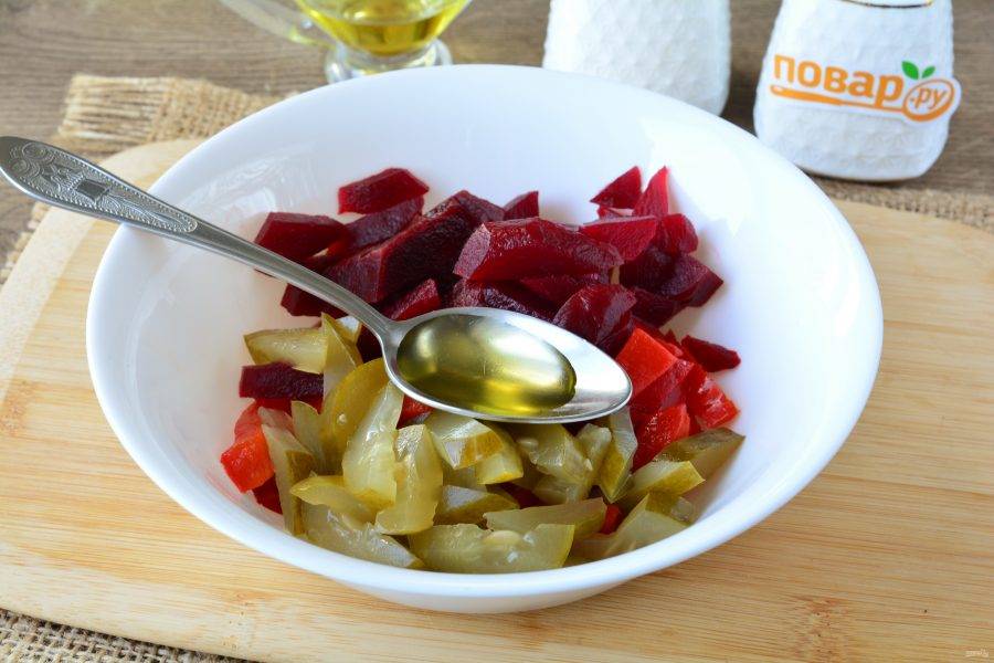Полейте салат растительным маслом, хорошо подходит домашнее ароматное масло, нерафинированное.