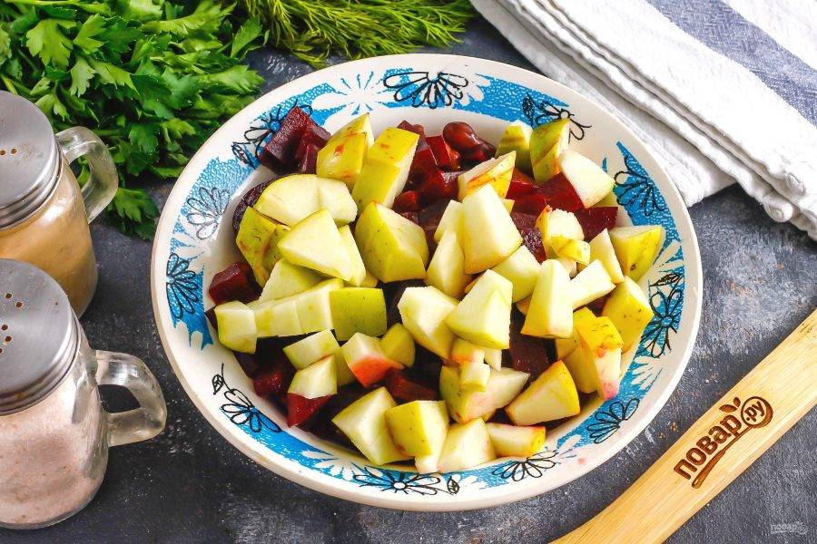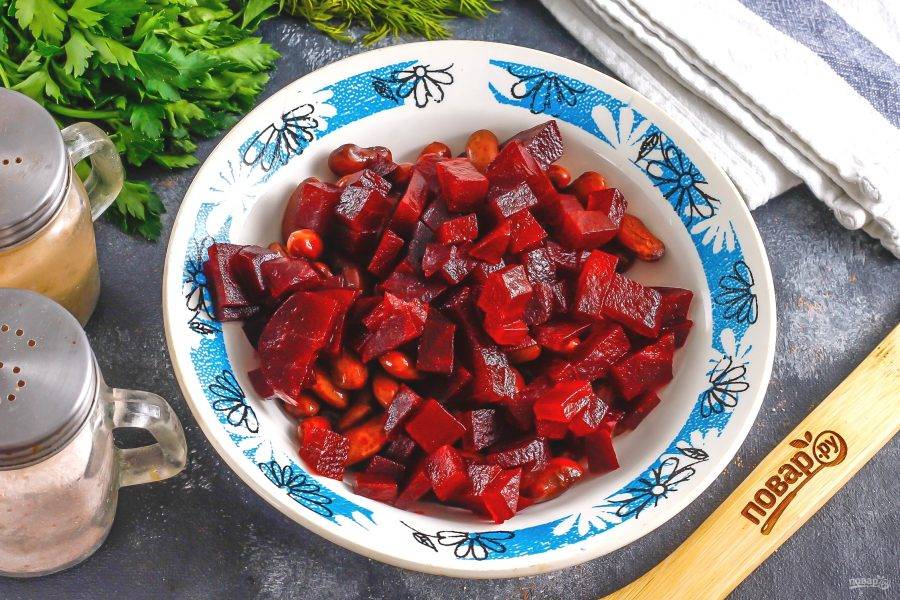 Отваренную свеклу очистите от кожуры, промойте в воде и нарежьте порционными кубиками. Добавьте в емкость к фасоли.