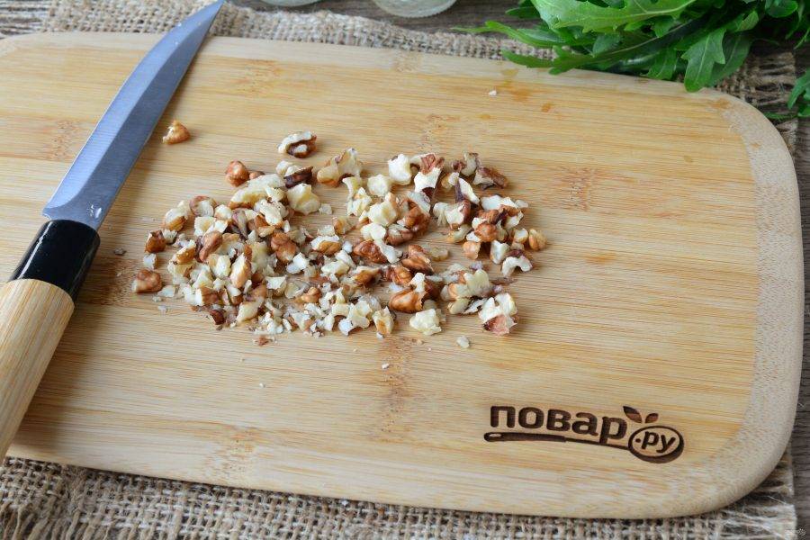 Измельчите грецкие орешки, нарежьте ножом.
