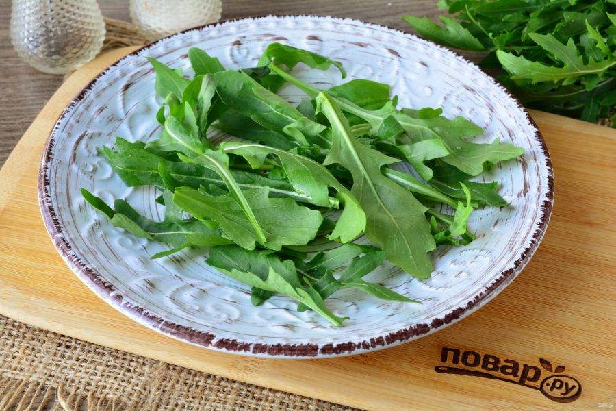 На тарелку выложите вымытую рукколу.