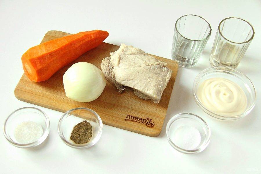 Подготовьте все ингредиенты. Свинину отварите заранее в подсоленной воде и остудите.