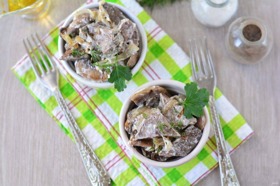 Смешайте в миске свиное легкое и жареные грибы с луком. Заправьте салат майонезом. Посолите и поперчите по вкусу.