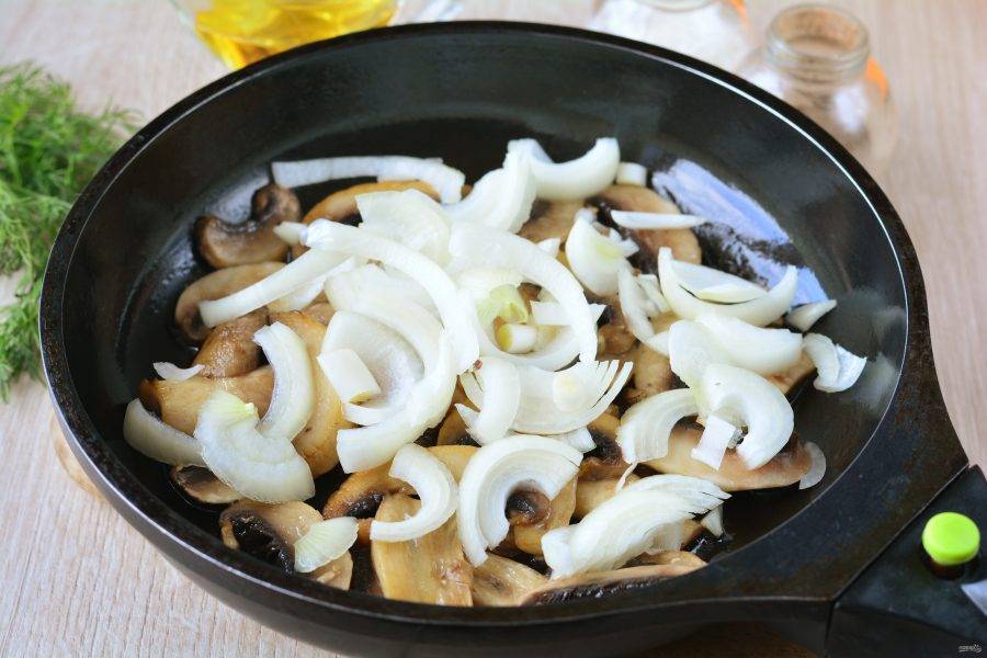 Жарьте грибы с луком еще 4-5 минут на среднем огне, помешивая. Затем остудите.