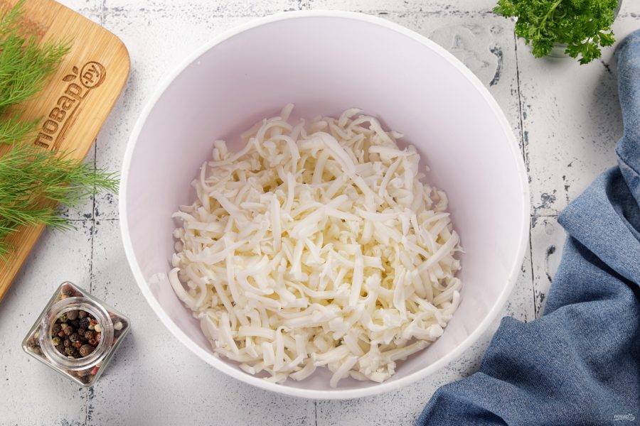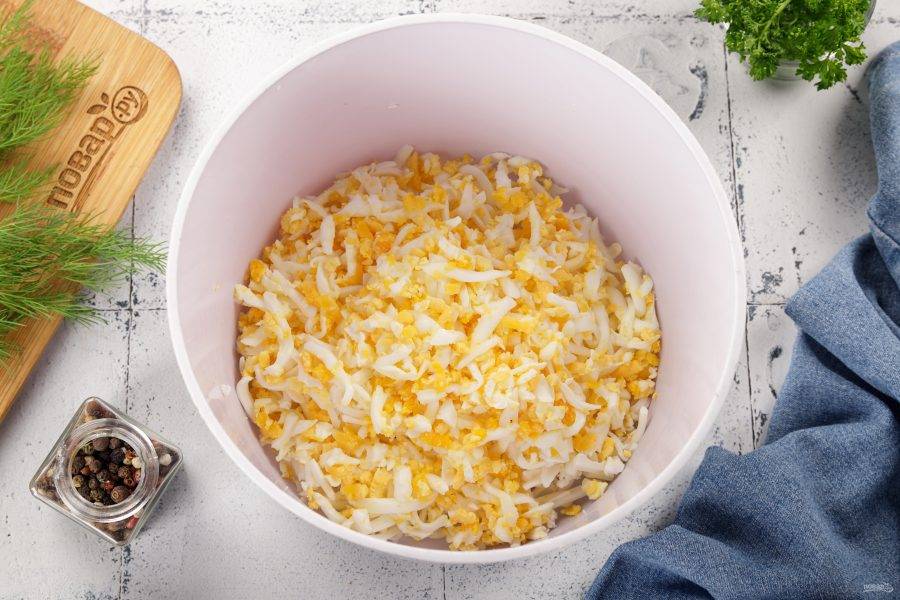 Подготовьте все ингредиенты по списку. Яйца отварите и дайте остыть. Сыр для этого салата можно взять как твёрдый, так и плавленый. Мне нравится с сырками «Дружба». Если вы используете мягкий плавленый сыр, то рекомендую заранее его убрать в морозилку.